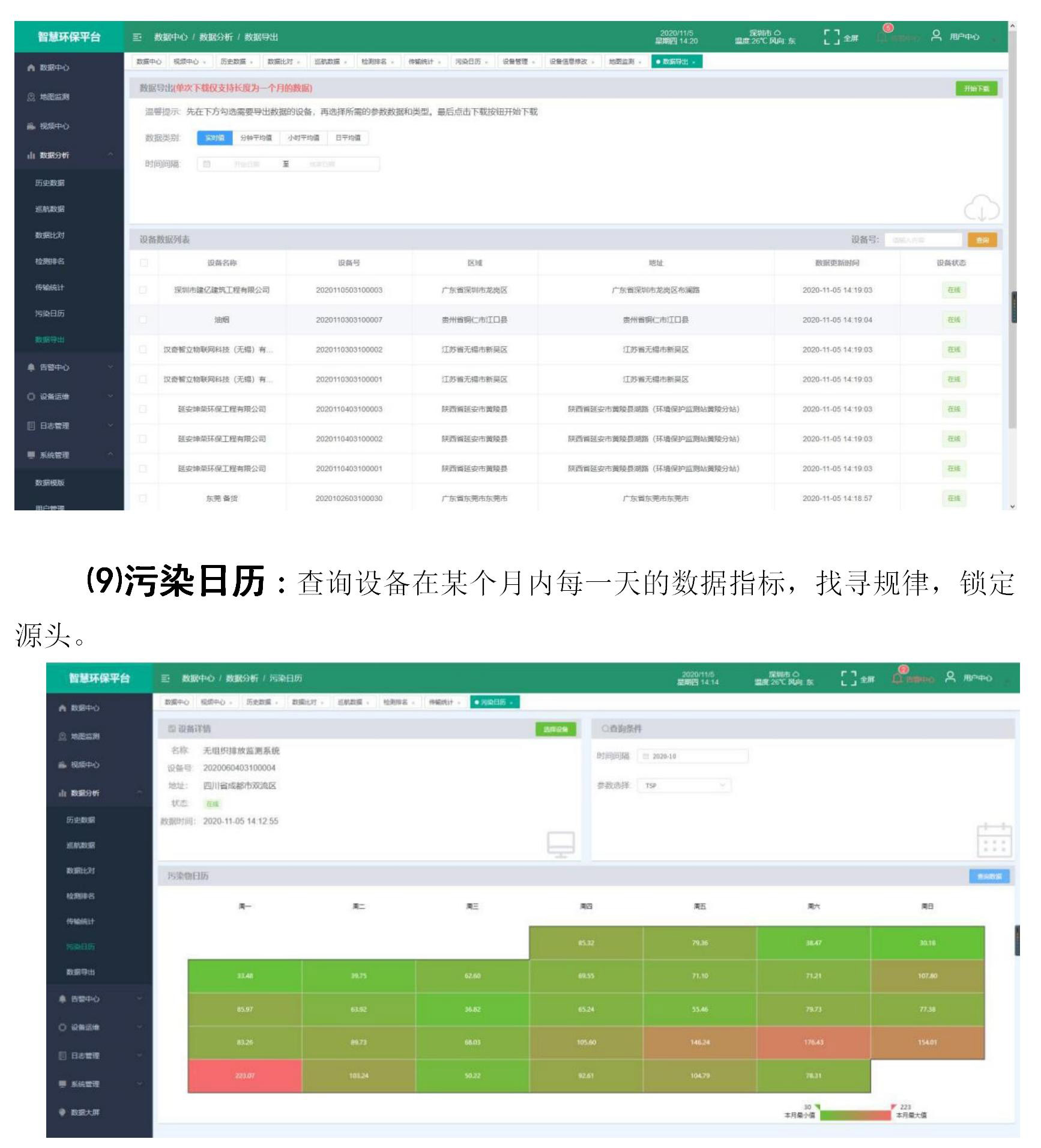 ⑼污染日歷:查詢設(shè)備在某個(gè)月內(nèi)每一天的數(shù)據(jù)指標(biāo),找尋規(guī)律,鎖定源頭。